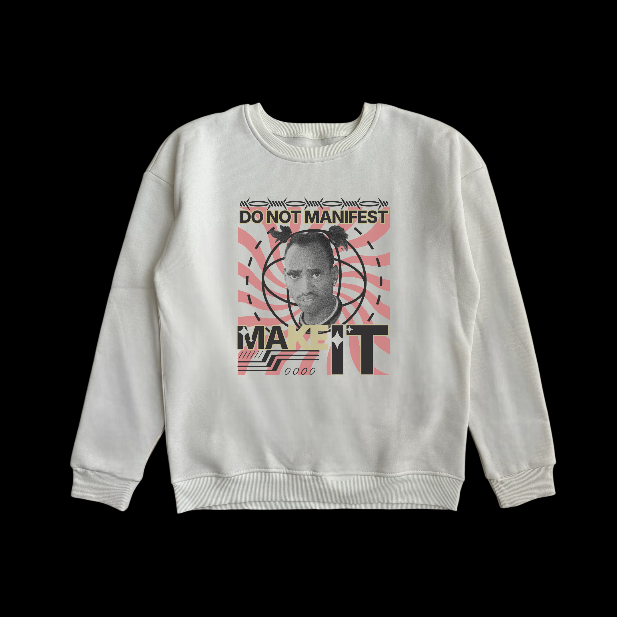 Üzerinde ‘Do Not Manifest, Just Make It’ yazan bu ironik ve cesur sweatshirt ile kalıpları kırın! Hayallerden ziyade harekete inananlar için tasarlandı; bu esprili mesaj, dilemek yerine harekete geçmeyi hatırlatıyor. Yumuşak ve kaliteli kumaşıyla hem konforlu hem de dikkat çekici bir parça—çünkü hayal kurmak güzel, ama yapmak daha güzel!”