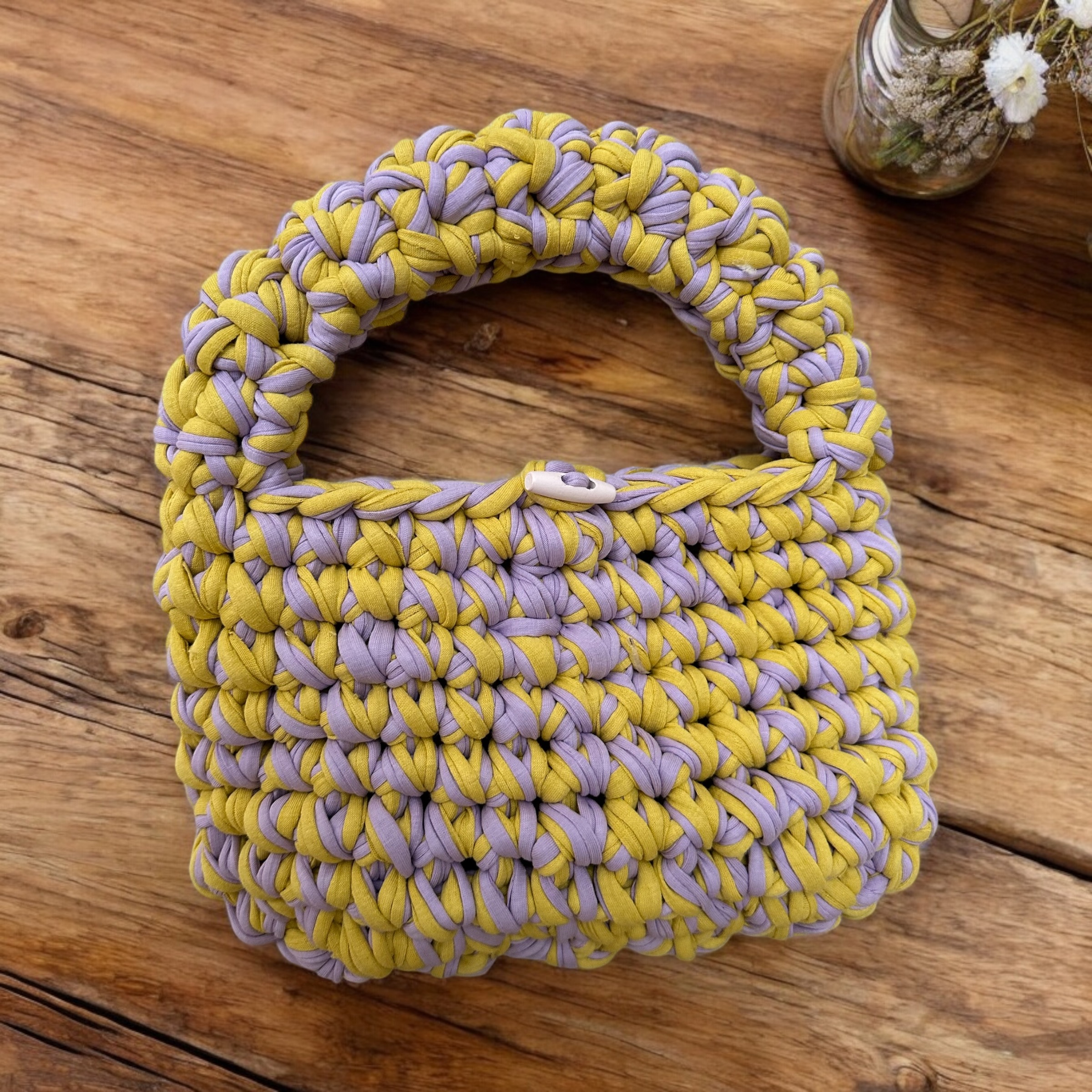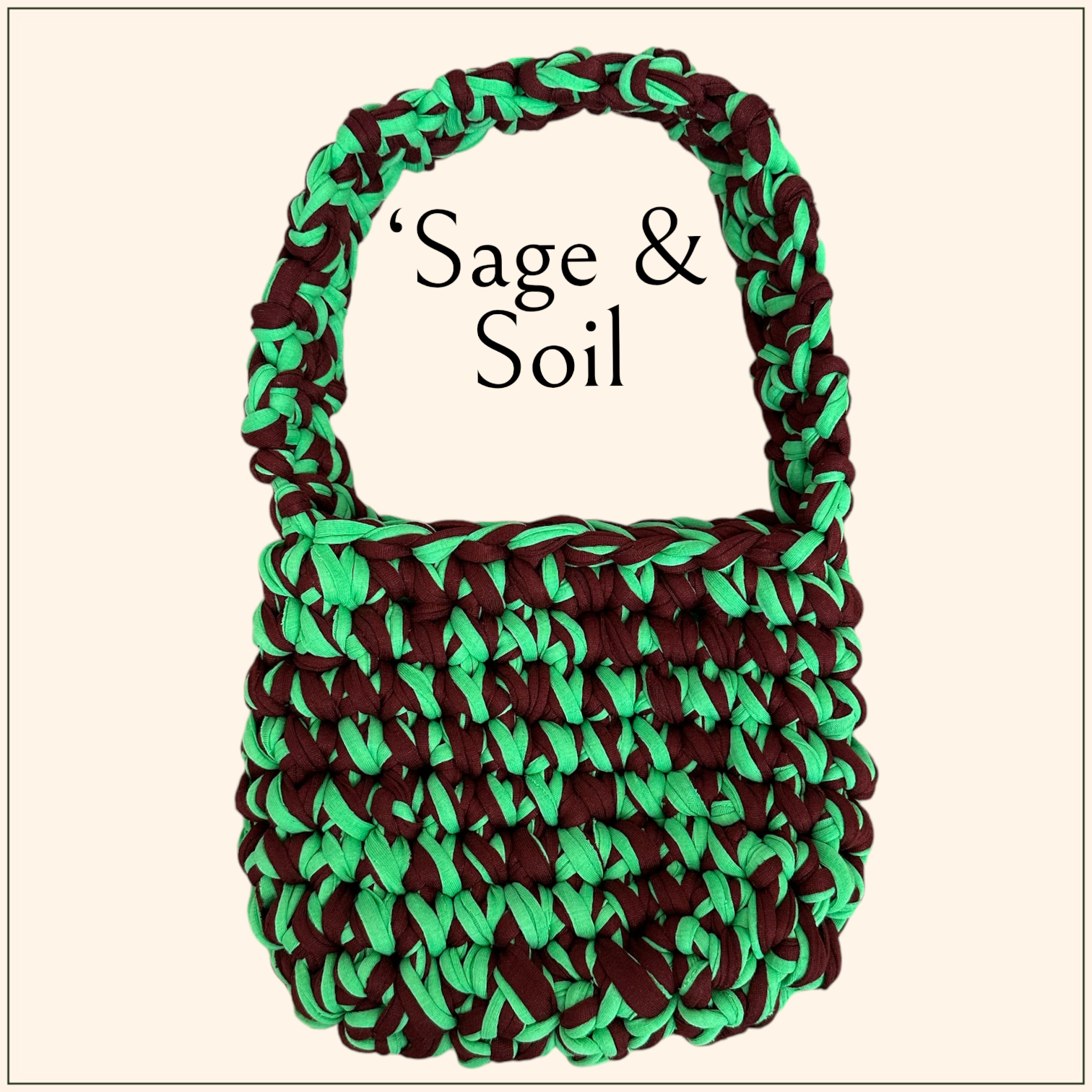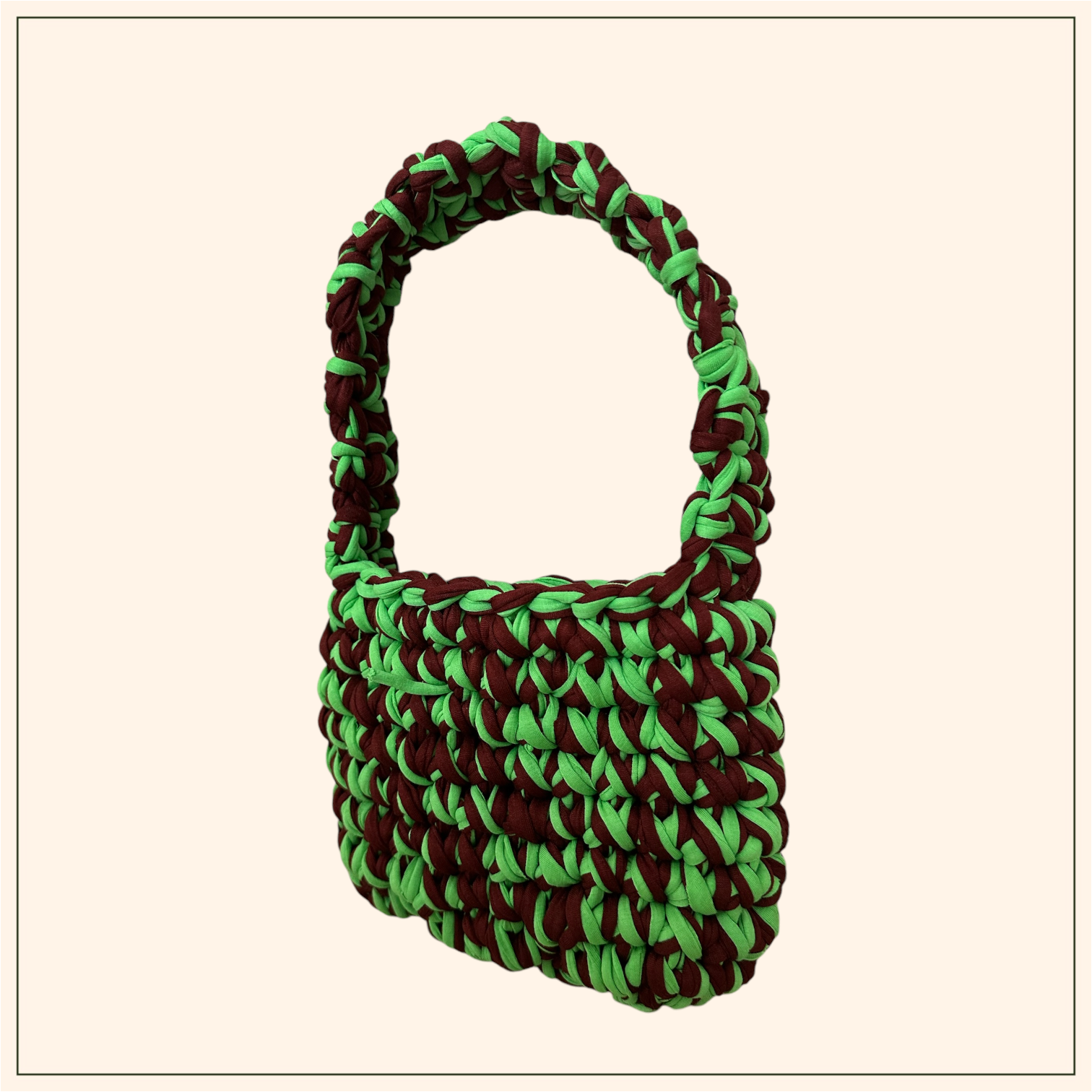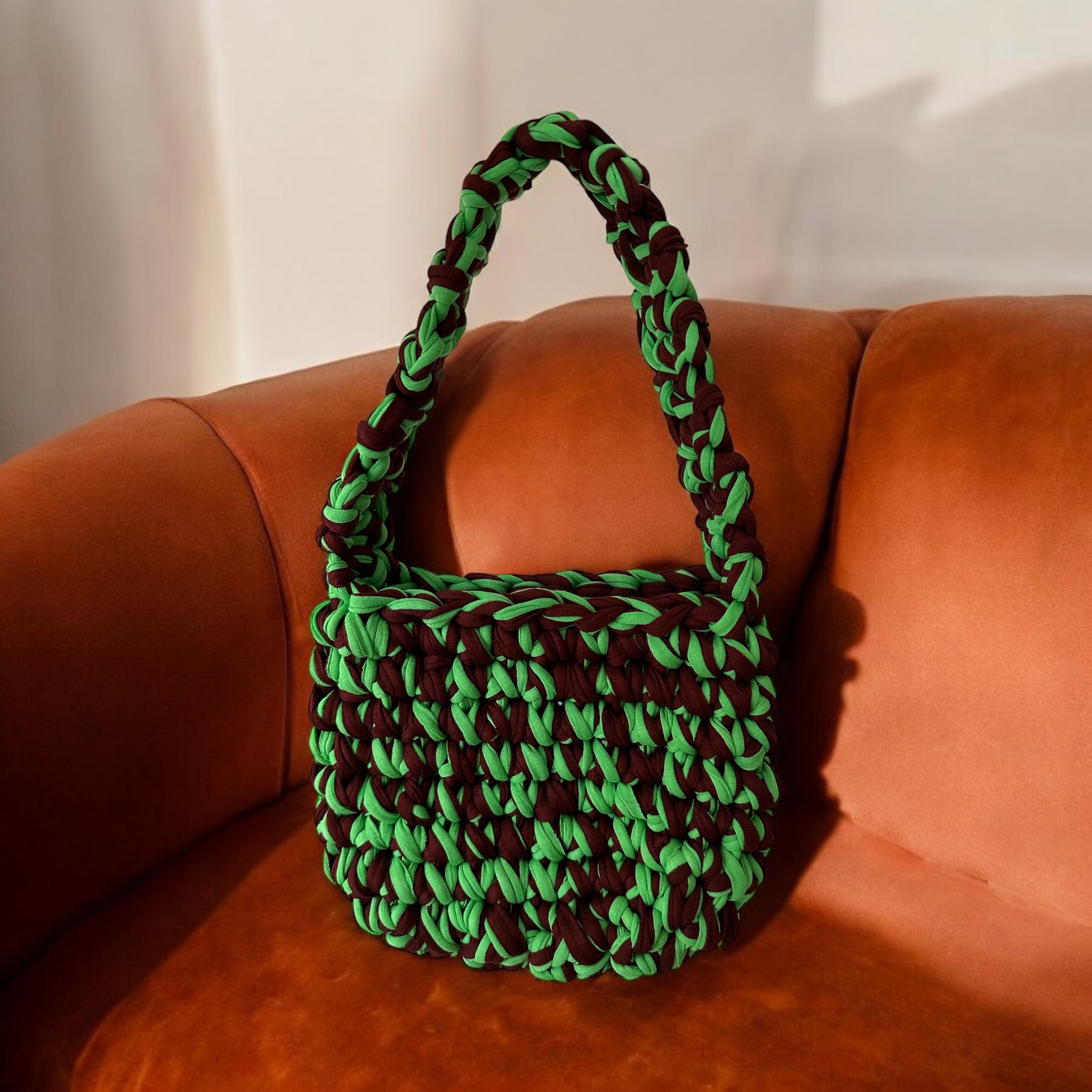 Özgün stilinizin anahtarı olan bu yeşil ve kahverengi penye ip örgü çanta, sokak stilinize rahat ve doğal bir dokunuş katıyor. %100 el yapımı ve çevre dostu malzemelerle üretilen bu çanta, sürdürülebilir modayı benimseyenler için ideal.