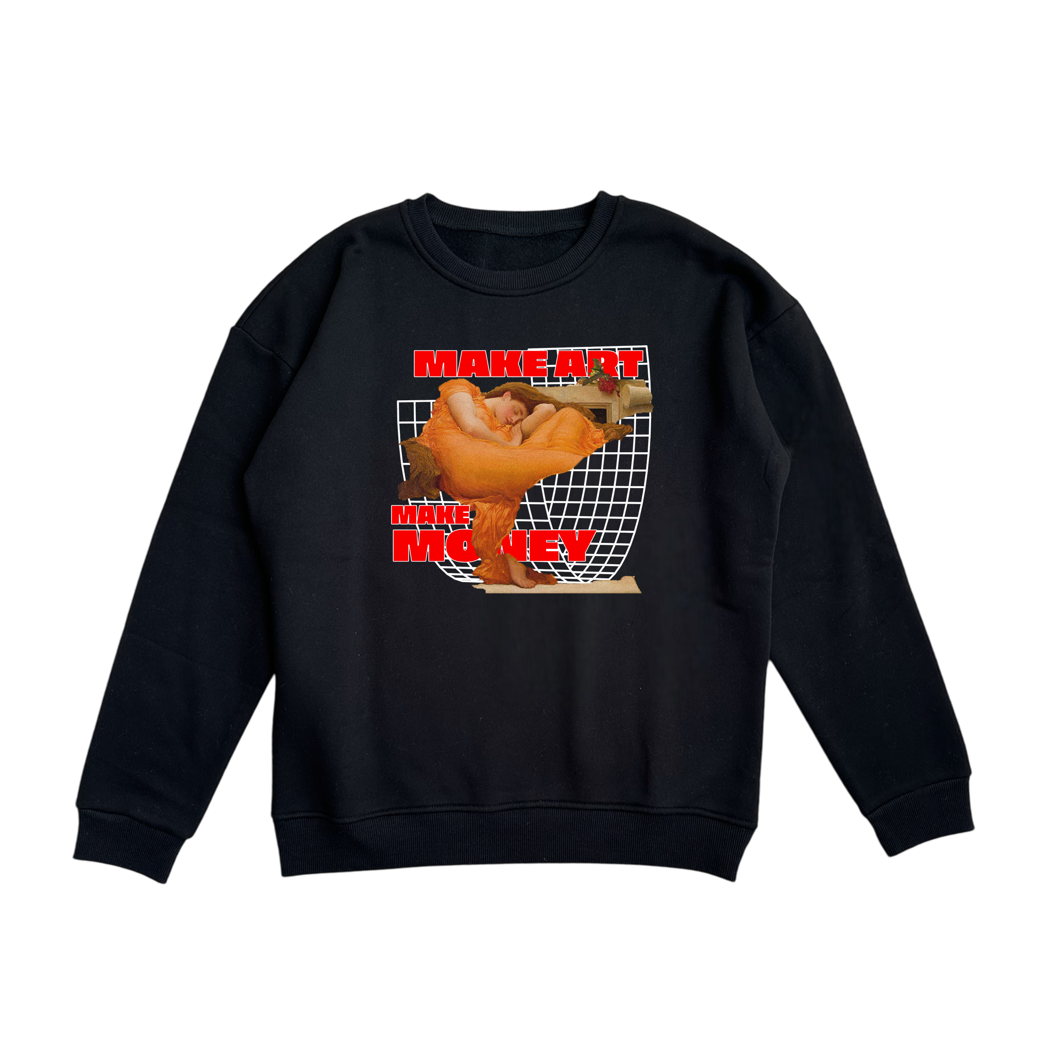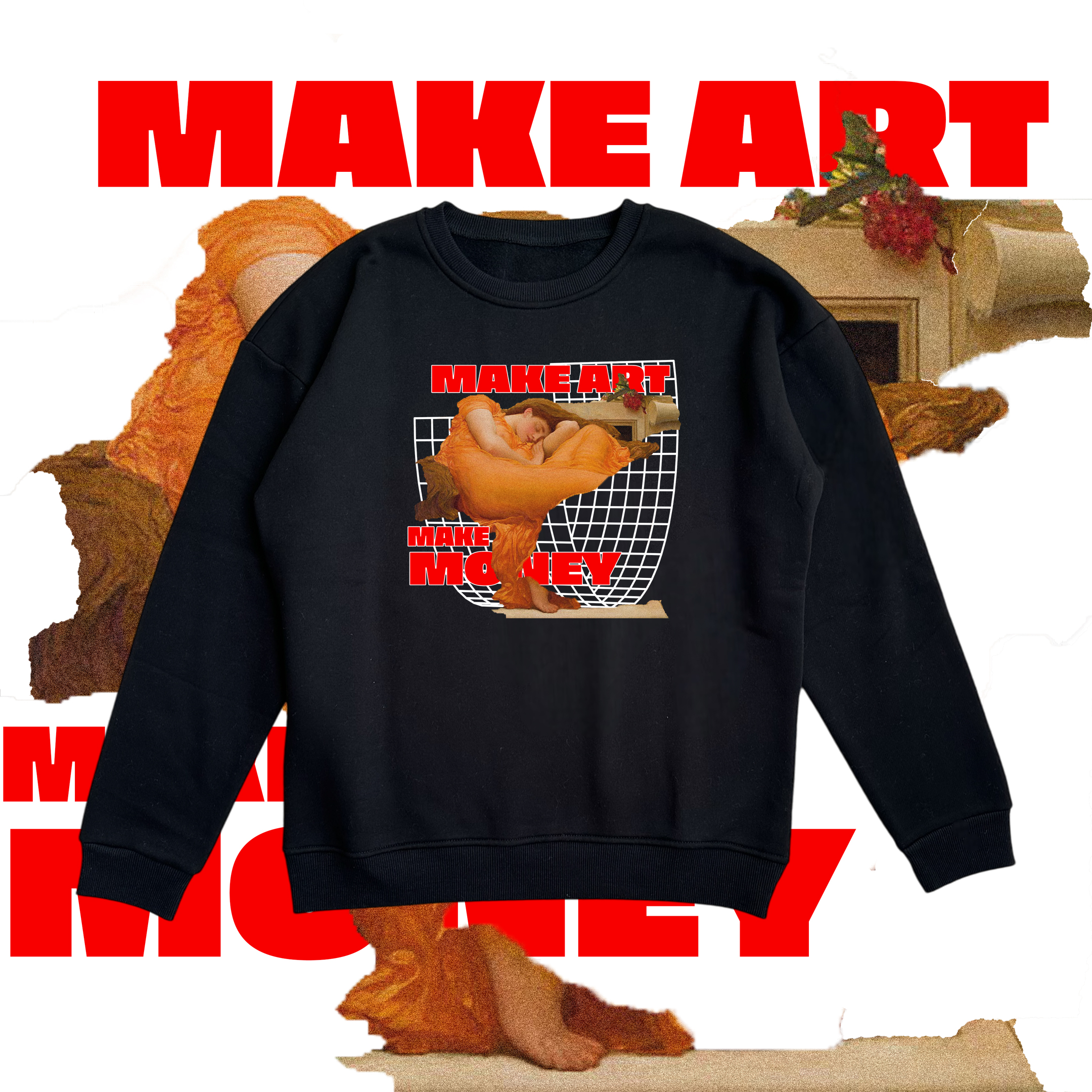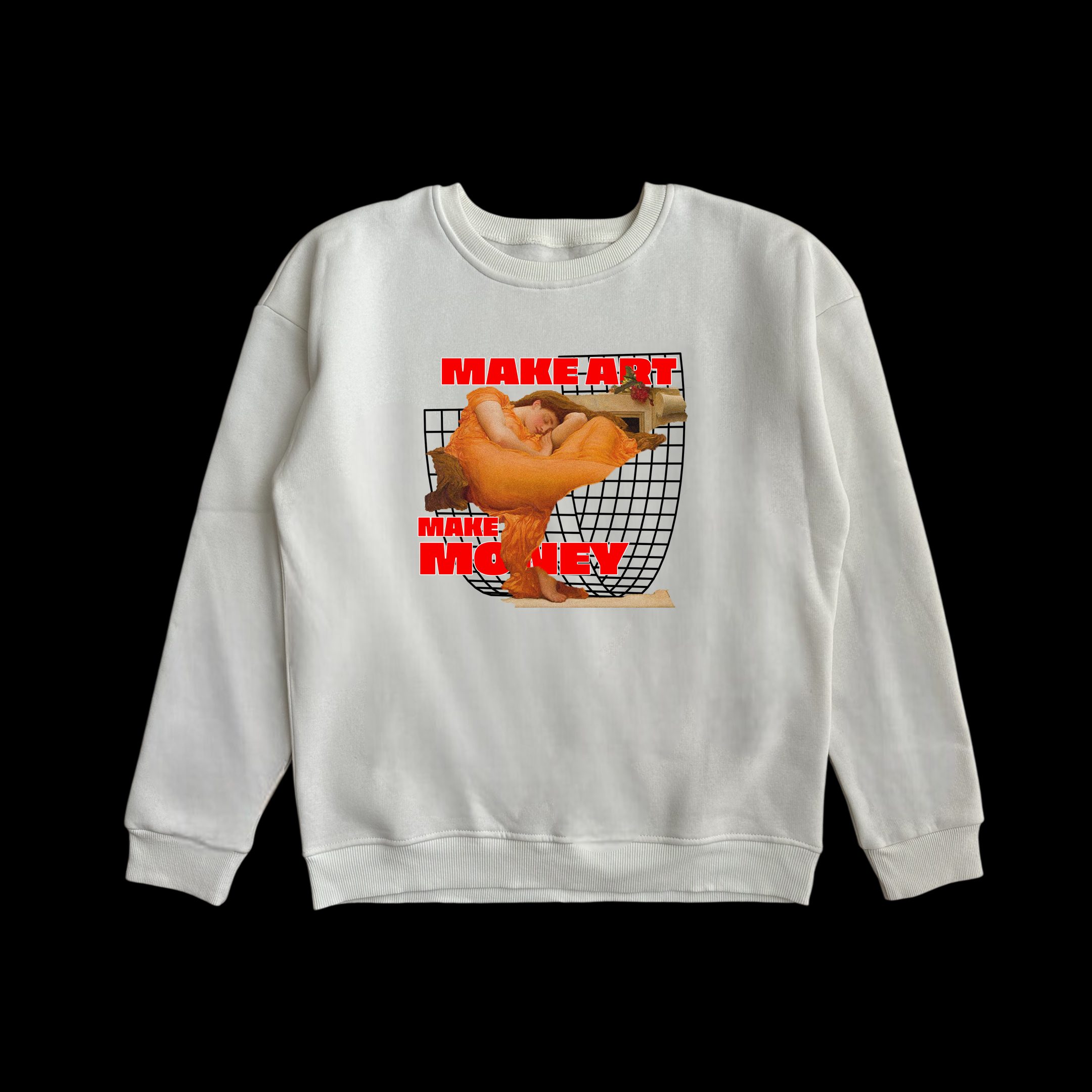 Sanatın zarafeti ve modern dünyanın gerçekleri tek bir tasarımda buluşuyor! Üzerinde “Make Art, Make Money” sloganı ve sanat tarihinin unutulmaz eseri Flaming June resmi bulunan bu sweatshirt, yaratıcı ruhunuzu ve pratik yanınızı mükemmel bir uyumla ifade ediyor.